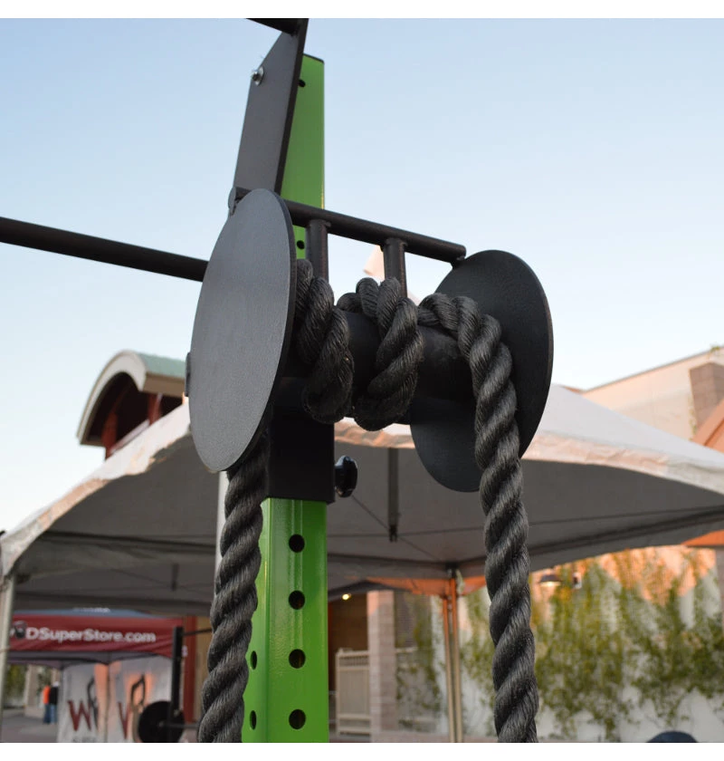 Affix the attachment to your rack or rig, high or low for resistance rope pull exercises. Best if used with a 1.5″ diameter synthetic rope.