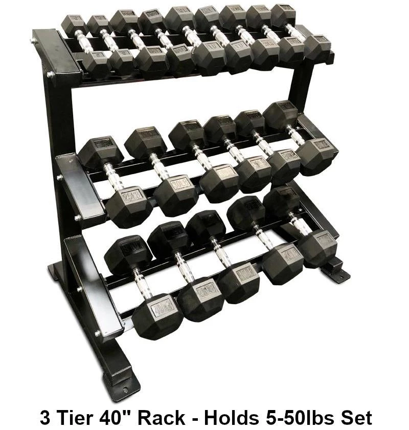 5-50lb rubber hex set + 3 tier 40″ Dumbbell Rack